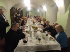 Po Eucharystii odbyło się wspólne świętowanie przy pięknie udekorowanym długim stole, za którym zasiedli wszyscy członkowie Apostolstwa Modlitwy i goście. Każdy z uczestników otrzymał artystycznie, ręcznie wykonane ozdobne kartki z cytatami biblijnych mądrościowych sentencji i z tekstami świętych Pańskich. Długo rozmawiając, jedząc i śpiewając wraz z zaproszonymi współbraćmi jezuitami spędziliśmy mile ten wyjątkowy czas. Smaczne potrawy i słodkie wypieki przygotowały oddane Panie z Apostolstwa Modlitwy. Szczególnie smakowały nam kapuściane krokiety i czerwony barszczyk. Na zakończenie wznieśliśmy jubileuszowy toast i podziękowaliśmy ks. Proboszczowi za wino oraz „krówki mordoklejki”.