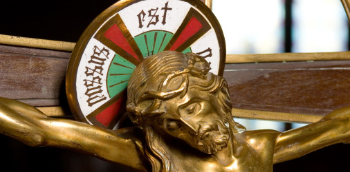 Wokół głowy Jezusa, na emaliowanej aureoli widnieje łaciński napis: Passus est pro nobis - „Cierpiał za nas”. Na obręczy spinającej ramiona krzyża widnieje wygrawerowany łaciński napis: Se moriens in pretium – „Stał się ceną okupu przez swą śmierć”. Tekst pochodzi z Hymnu św. Tomasza z Akwinu Verbum supernum prodiens, odmawianego na jutrznię w uroczystość Bożego Ciała. Na obręczy pomiędzy wyrazami napisu znajduje się szereg wytłoczonych, okrągłych, miniaturowych rozetek.